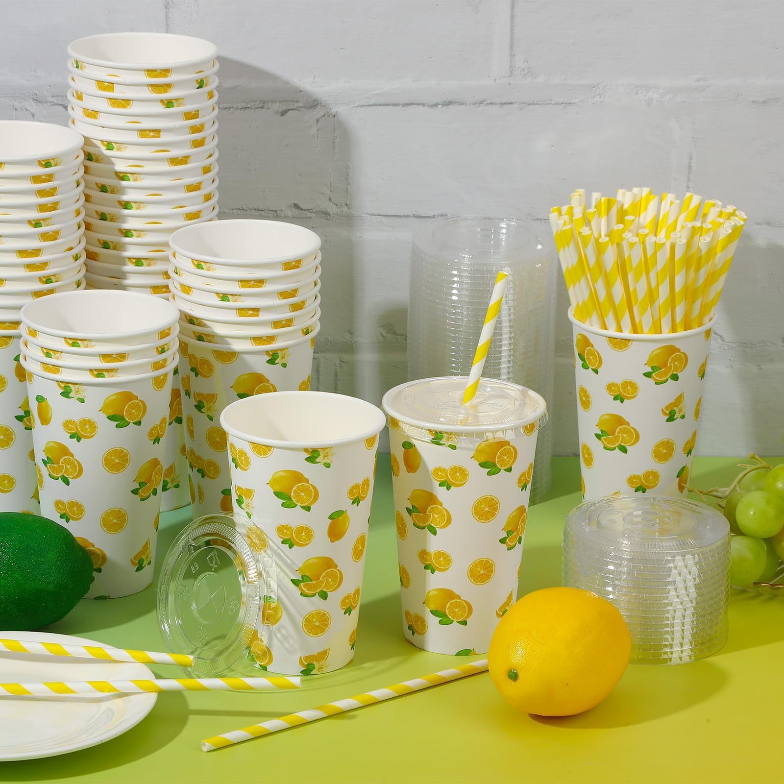 180pcs Lemonade Paper Cups With Lids And Straws 16oz Disposable Cups For Lemon Stand Supplies Summer Party Hot Cold Beverage,Amazon Is Banned,654-10328-G13