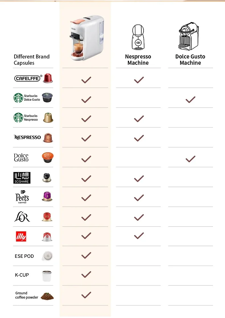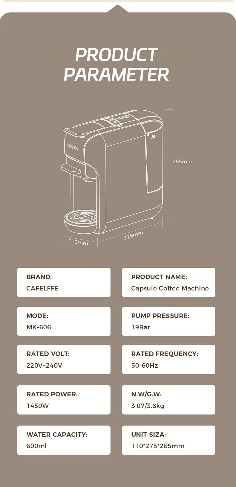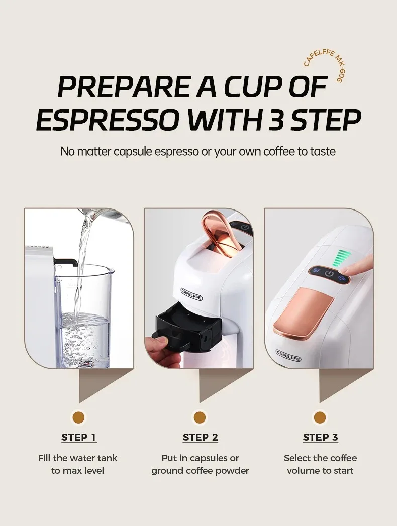 ★【5 In 1 Compatible Design】Cafelffe capsule coffee machine is compatible with Nes* original capsule、Dolce Gusto* capsule、K-cup capsule、ESE coffee pods and coffee powder. Can satisfy a variety of coffee needs, not need to purchase different machine.