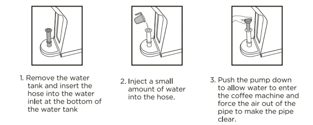 Before using for the first time or after long pauses (e.g. holidays) the machine may be difficult to pump water, this short procedure can help pump to self priming by using the pipe to fill water into the circuit manually prior to turn on the machine for first refil.