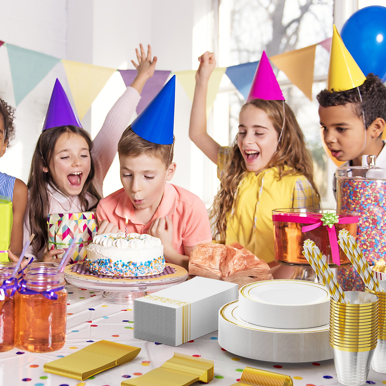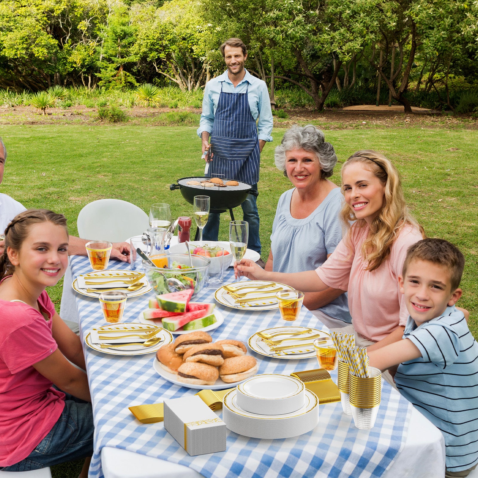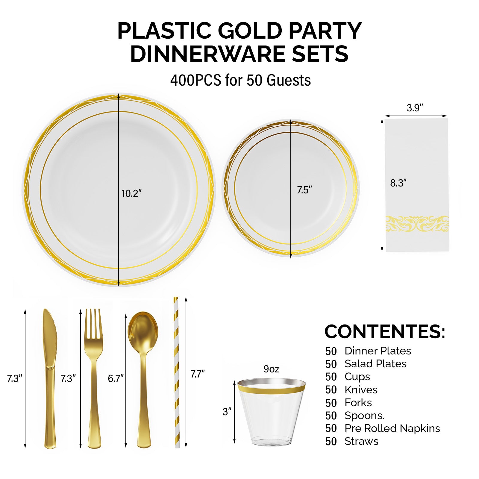 Set Of 50 Flat Plastic Round Gold Disposable Cutlery Containing Large And Small Plates, Cups, Cutlery, Paper Towels, Straws
