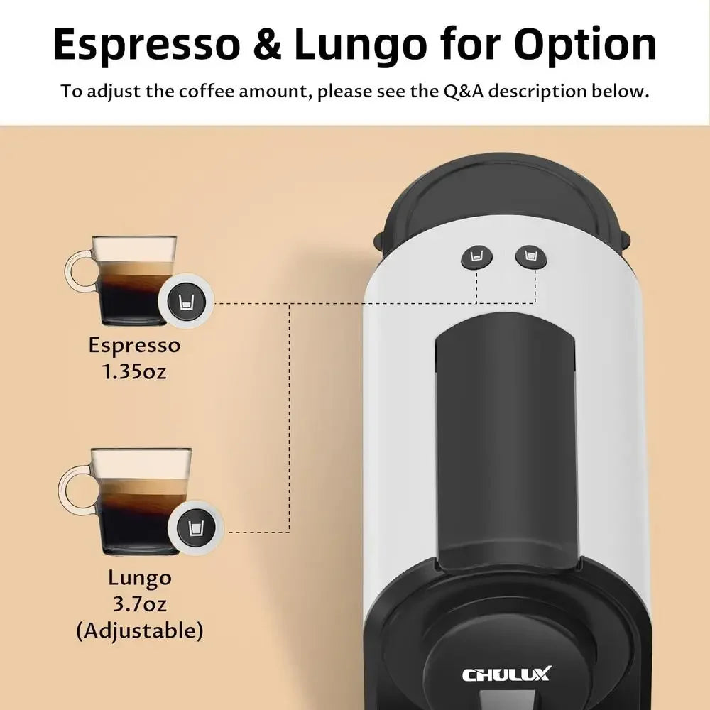 The CHULUX espresso pod machine is compatible with Nespresso capsules and other brands capsule for home made coffee.  Then choose the Espresso or Lungo button for better taste depending on different capsules and personal preference.