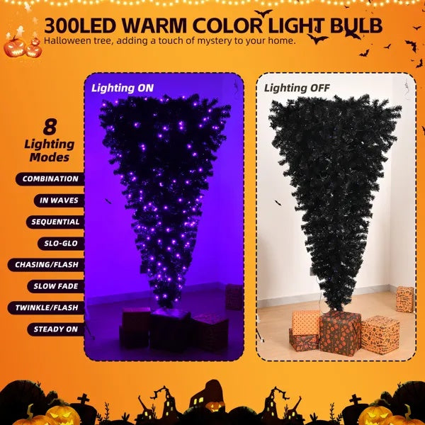 6 FT Pre-lit Upside Down Artificial Christmas Tree, Black Halloween Tree With 250 Purple Lights And Pumpkin & Skull Ornaments