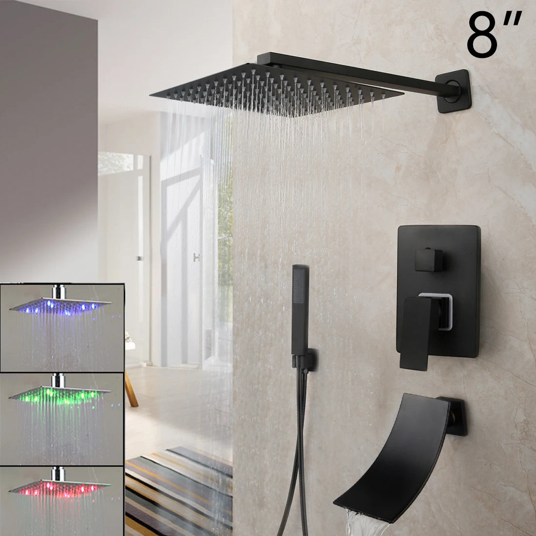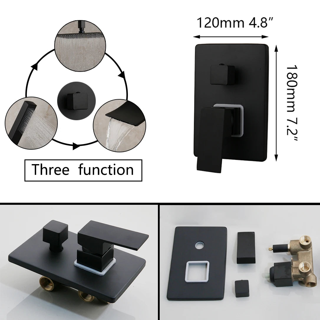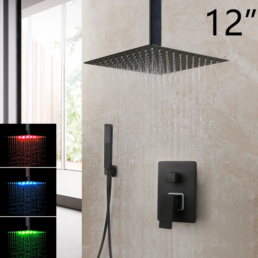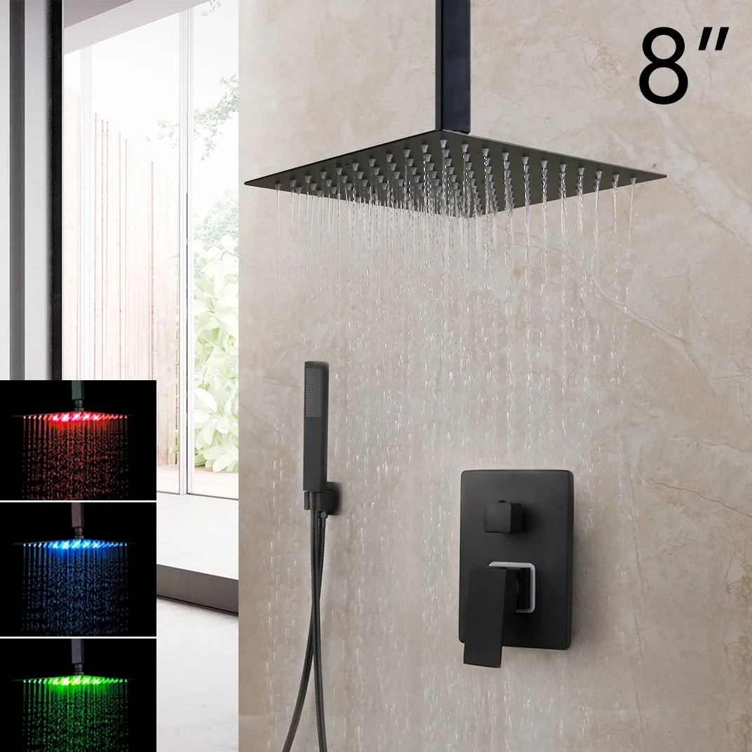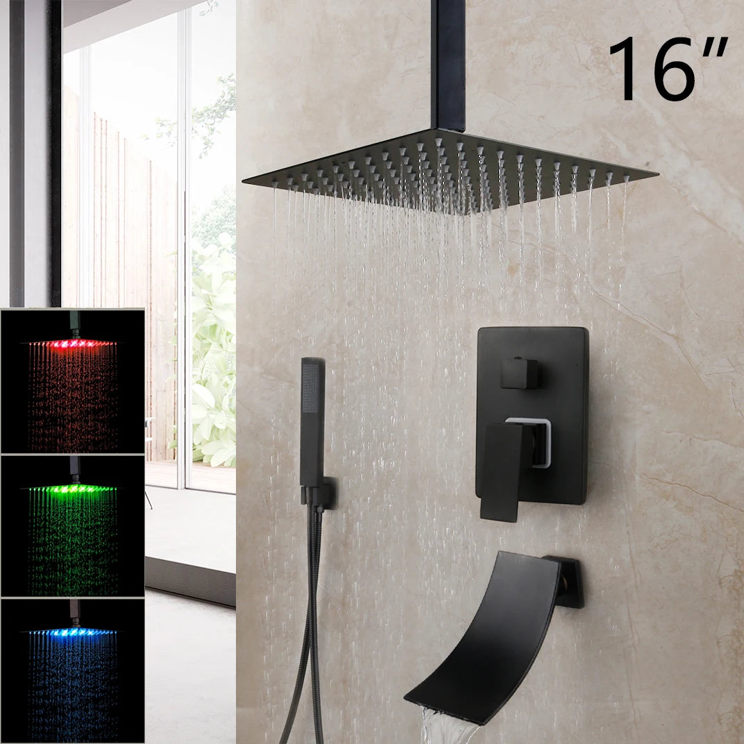 KEMAIDI Matte Black Bathroom Shower Faucet Rainfall Tub LED Bathtub Shower Systerm Rain Square Shower Head Waterfall Mixer Tap