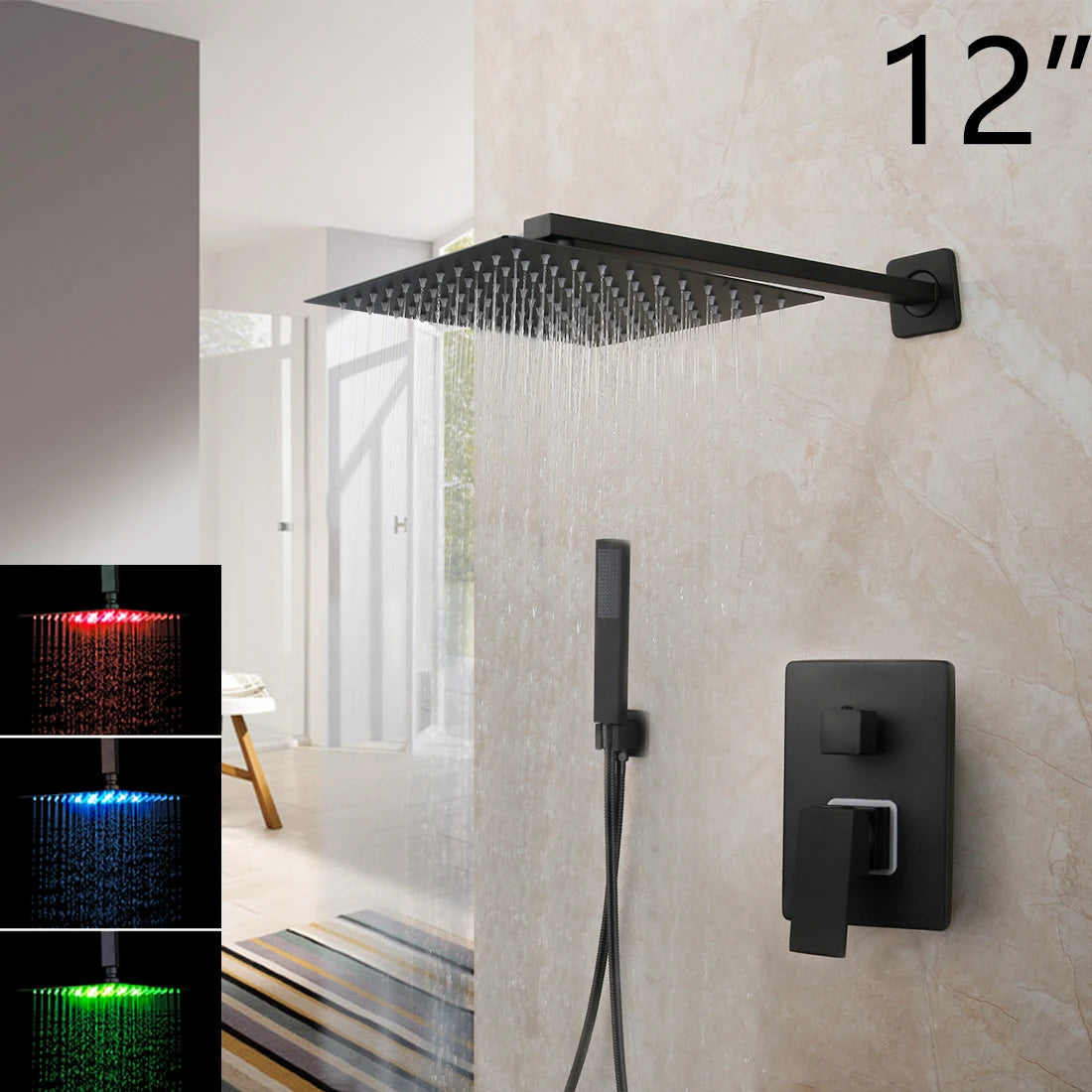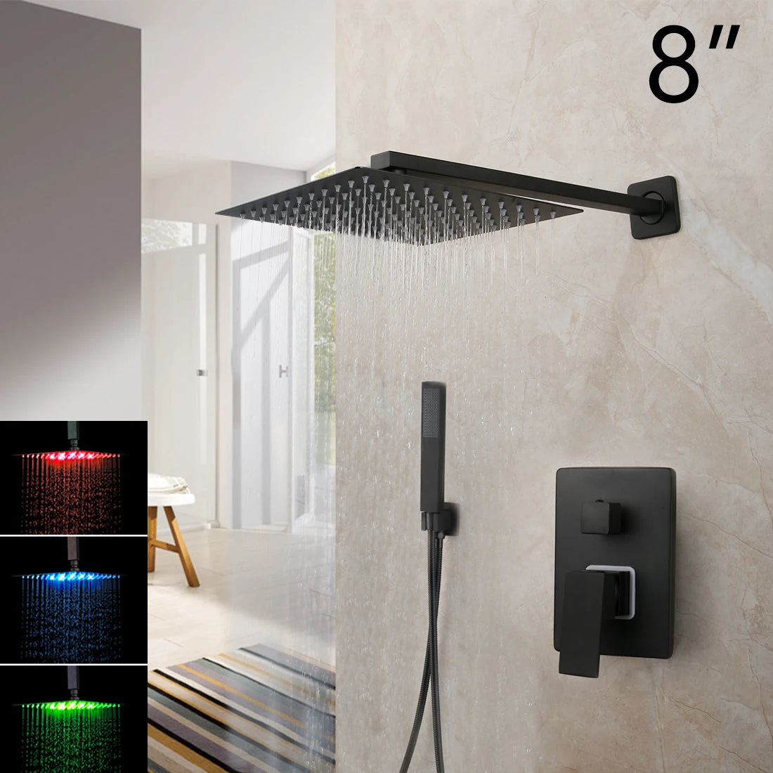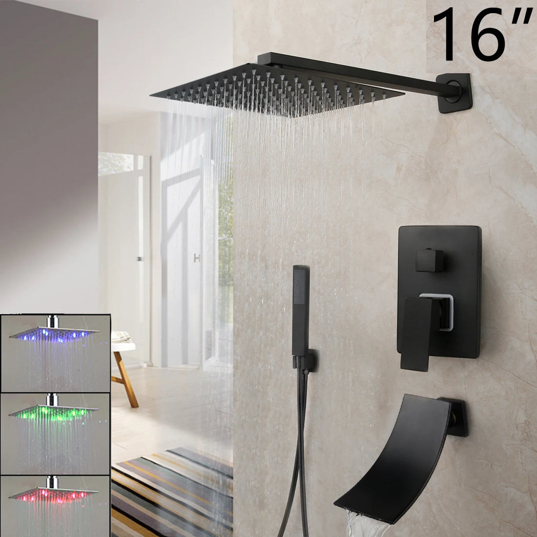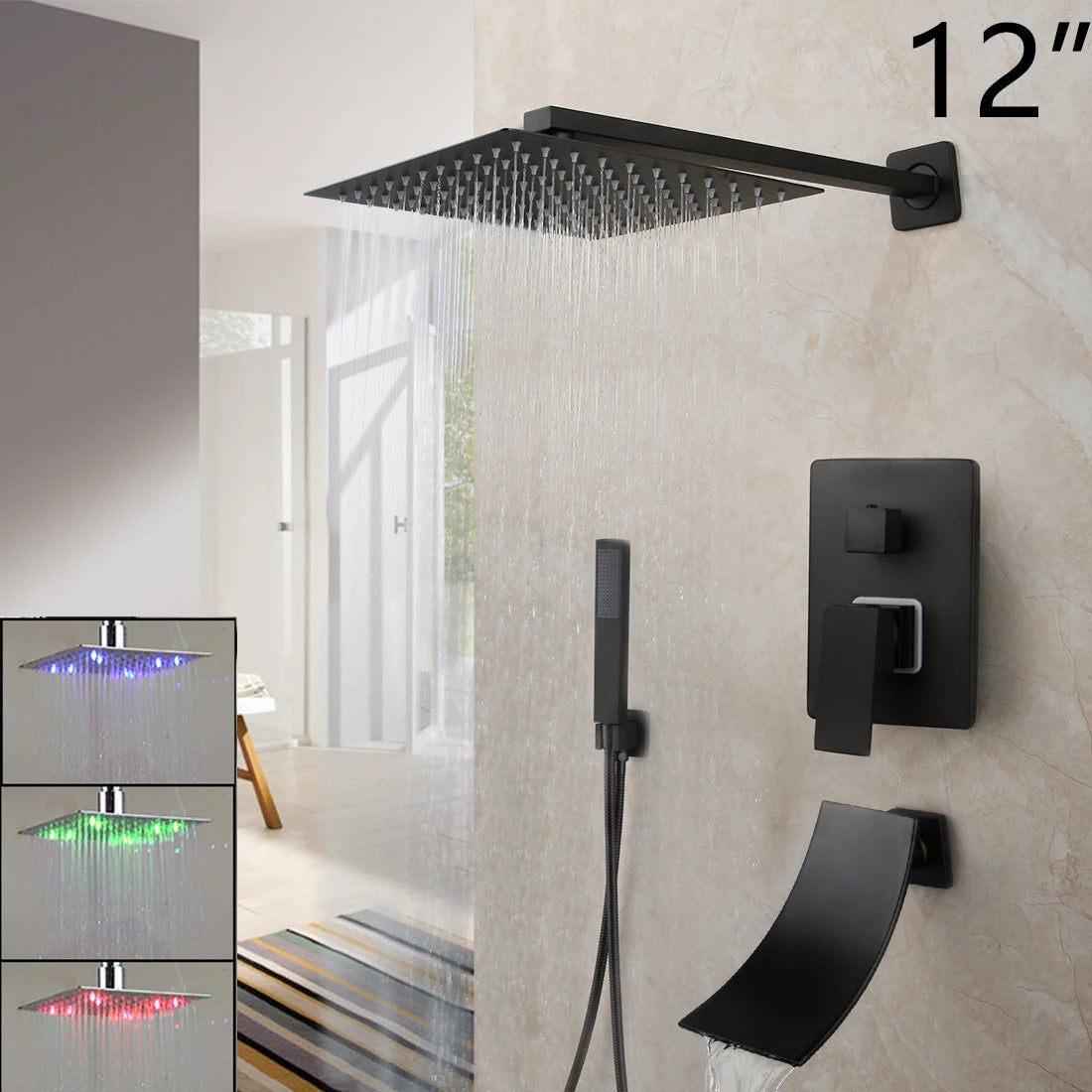 KEMAIDI Matte Black Bathroom Shower Faucet Rainfall Tub LED Bathtub Shower Systerm Rain Square Shower Head Waterfall Mixer Tap