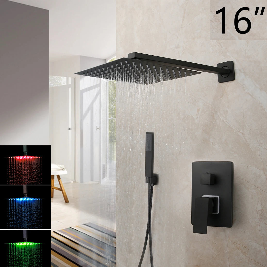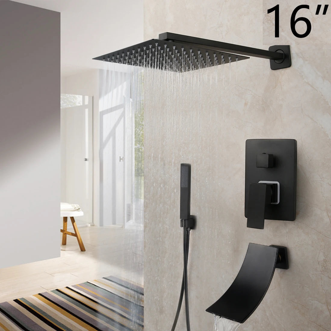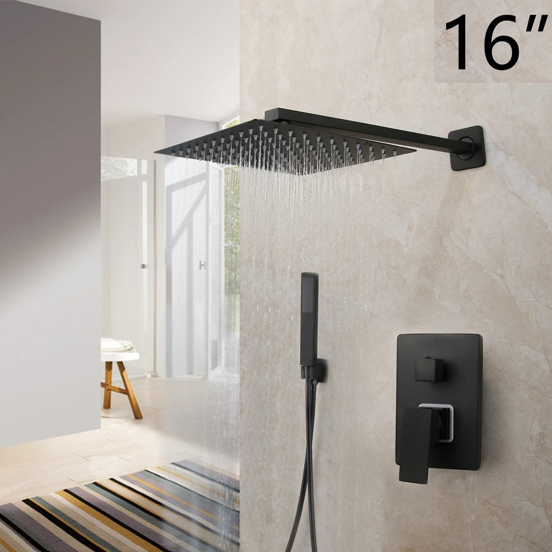 Shower system include: rainfall shower head and 16" wall mount shower arm, handshower head and 59“ shower hose, hand shower water connection, and brass shower valve with 2-way*3 way diverter