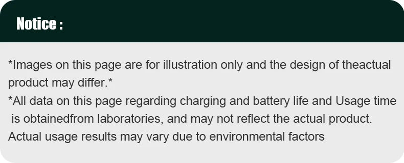 **All data on this page regarding charging and battery life and Usage timeis obtainedfrom laboratories, and may not reflect the actual product.Actual usage results may vary due to environmental factors