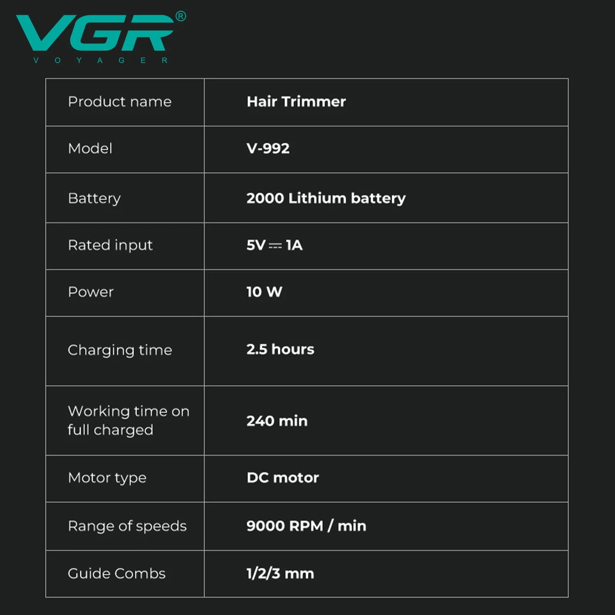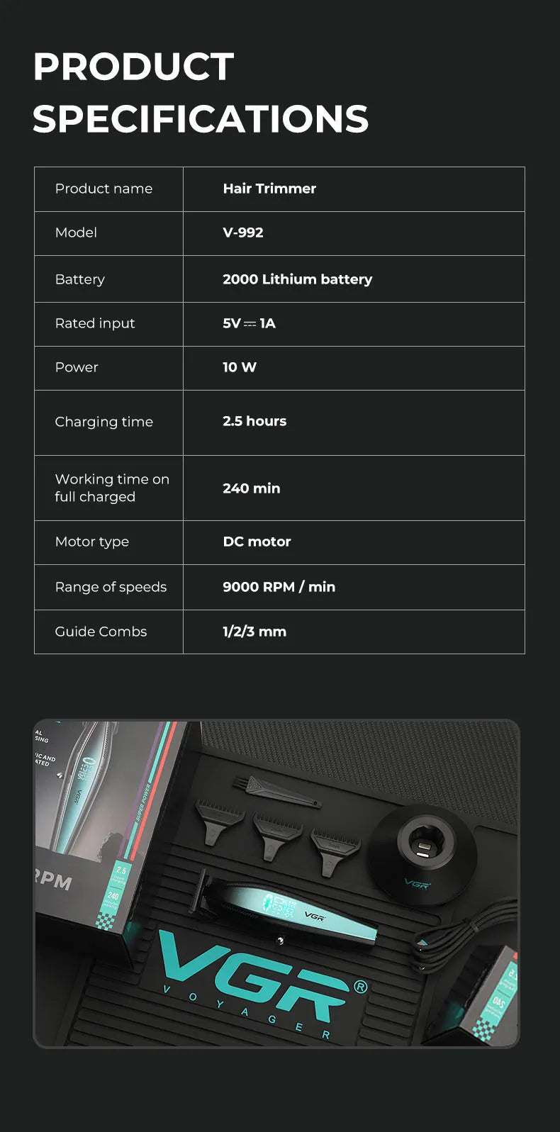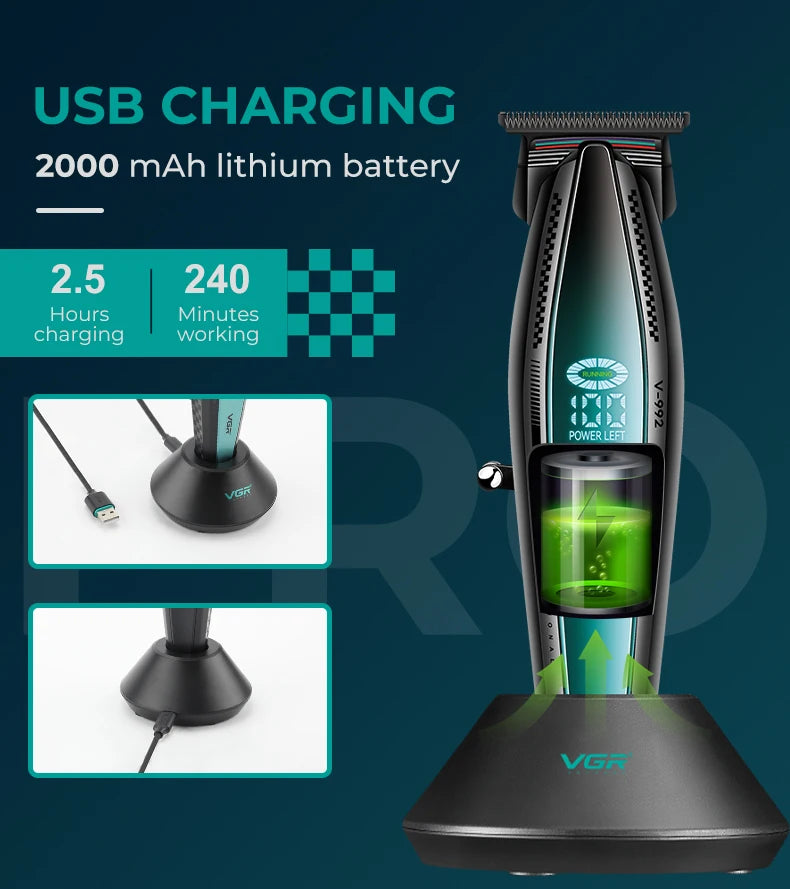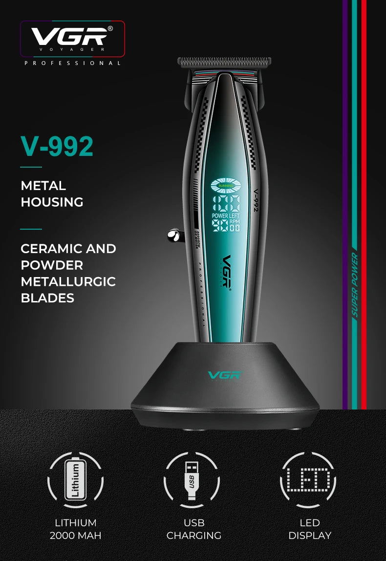 VGR Professional Hair Trimmer Electric Haircut Machine Rechargeable Hair Clipper 9000 RPM LED Display Hair Trimmer for Men V-992