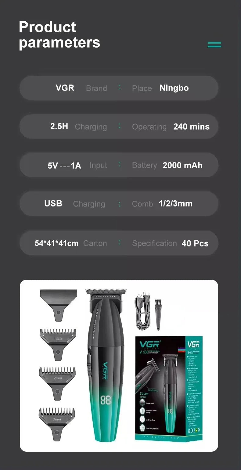 VGR Professional Hair Trimmer Electric Rechargeable Hair Clipper Beard Haircut Kit Barber Machine Facial Trimer for Men V-906